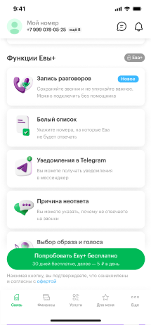 Еву или Еву+ можно подключить в Личном кабинете или приложении «МегаФон» в блоке сервисов в разделе «Связь». Виртуальный помощник доступен на любом тарифе.
